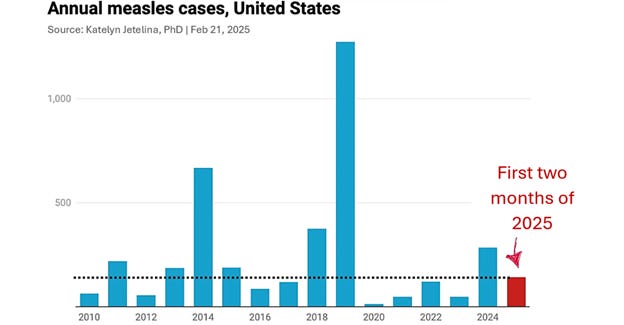 Texas has now had 159 cases with 10 more in the neighboring New Mexico county where the man lives. This is the worst US measles outbreak in at least six years. There had not been a US measles death since 2015, but due to anti-vax sentiment or ignorance, vaccination rates in many areas are now below the 95% level needed to provide herd immunity. In the first two months of 2025, US measles cases already exceeded the annual total in 8 of the past 15 years.