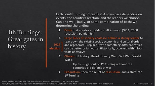 It’s important to think ahead now, as we’re going to need a lot more energy later. If you follow Generations theory, someone like Trump getting elected in 2024 was predictable: America was looking for “strong leadership.”1 In our current Fourth Turning chaos, the election was the second phase of the Turning. What comes next is a lot uglier. We’ll need every voice and far more action for that.