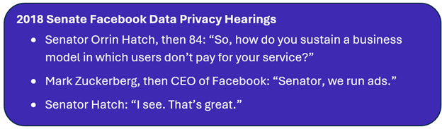 We Boomers take pride in hanging on by our fingernails to our career identities3, and we’ve battered our US media into believing any discussion of aging is at least sacrilegious if not punishable by law, which could be next. But…remember the embarrassment of the Facebook hearings?