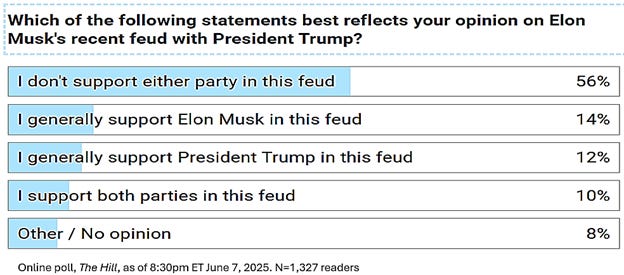 And just like that, the budget news that previously dominated every news site vanished. Whoosh. Google “Senate budget” as I write this (evening of June 7) and you’d think the world stopped on Thursday. Previews of the Sunday talk shows are vague, at best. The Big Fight will undoubtedly come up, but delicately. Bannon’s ecstatic celebration aside5 it’s likely few professional pols are interested in taking sides publicly or predicting this one, reflecting an online poll tonight from The Hill, below, and Trump’s advice to Vance. And no network wants to become another CBS and get sued by Trump for mental anguish; heaven forbid anyone cause him mental anguish.