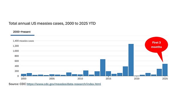 The two measles deaths this year were the first US measles deaths in over a decade. The graph below compares the 500+ cases in 20 states3 in the first three months of this year with total annual US cases since 2000. Measles spreads exponentially (not linearly), so the 500+ 2025 cases by late March will almost certainly eclipse the 2019 case rate. (Click on the graph and then the three ‘more’ buttons in upper right to enlarge the graph.)